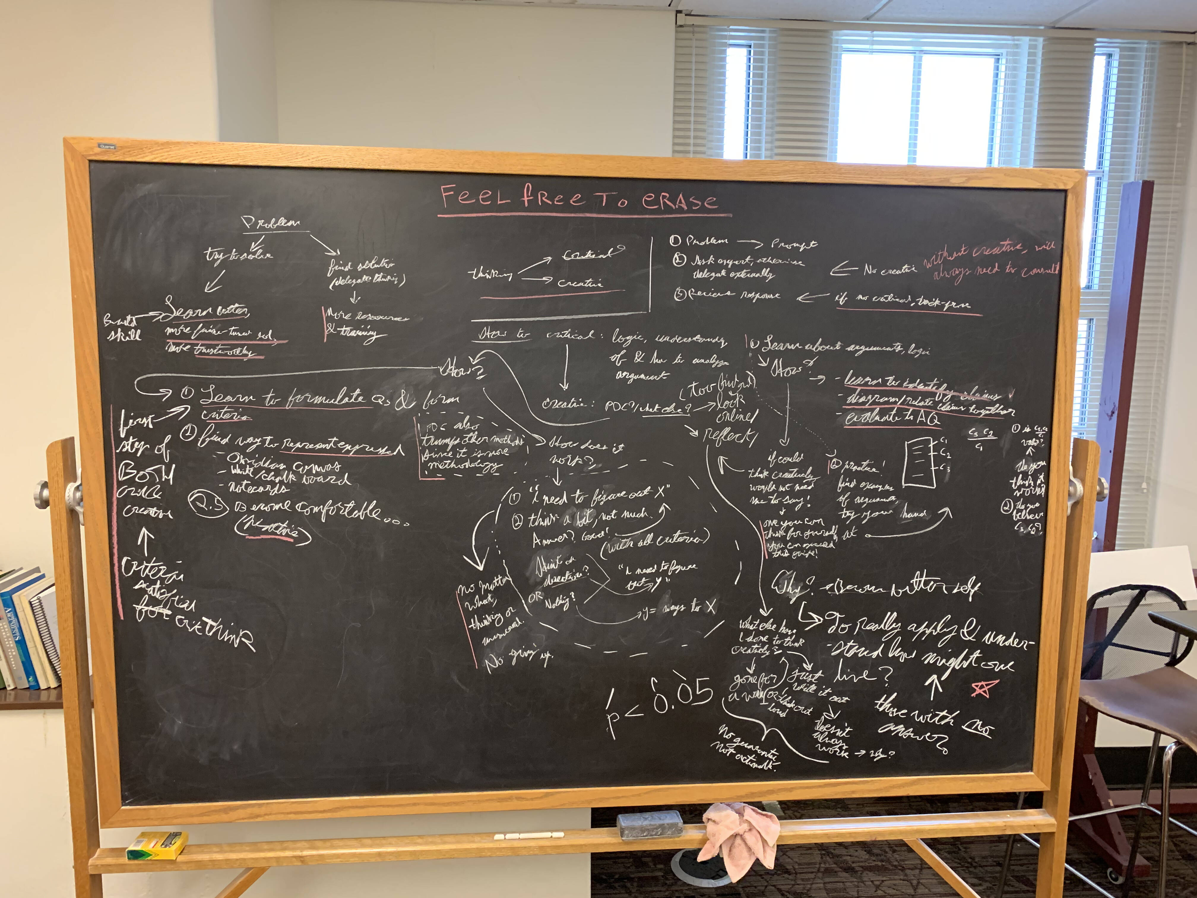 Thinking through expression, such as writing down a train of thought as it arises, helps in many important ways. Of note, expression creates an artifact of work. Just like building something with your hands, writing thoughts down provides feedback that encourages more work. The feedback loop of adding something and feeling proud of your addition keeps the process going.