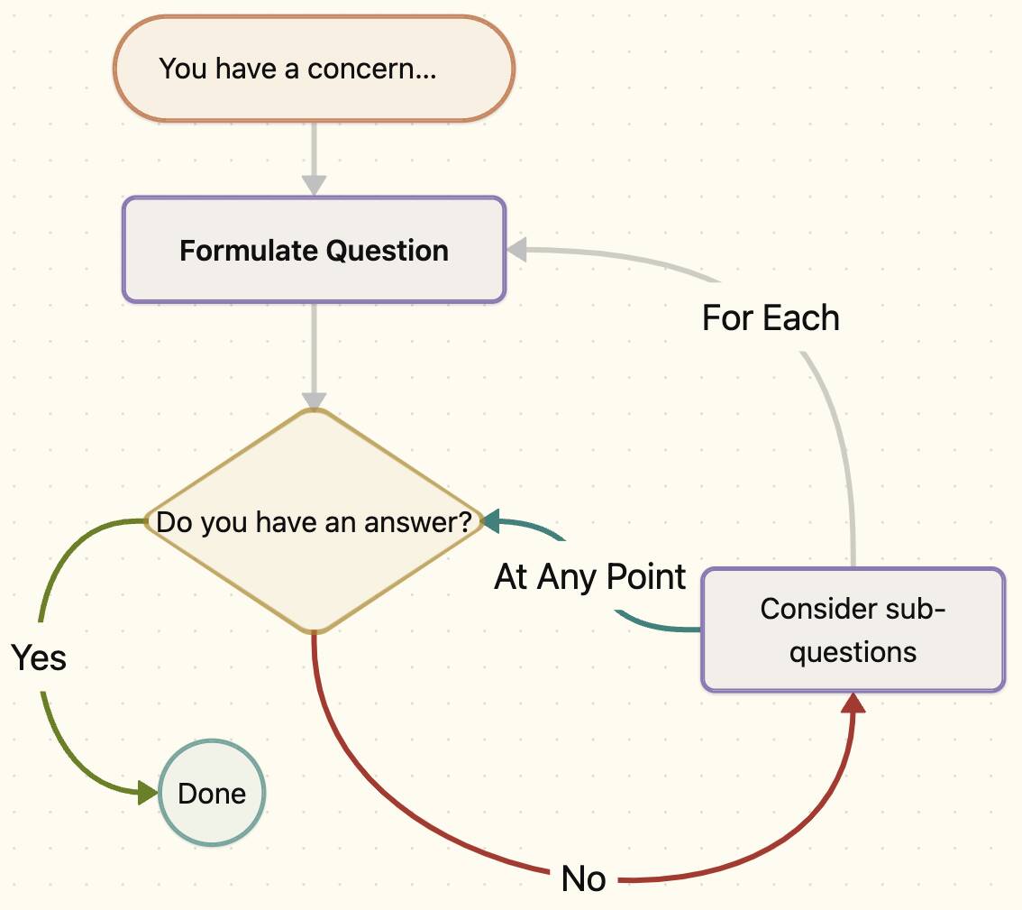 If an answer came to you, perfect! You have the answer to the question. If not, then begin a miniature version of the method, formulating questions you think might advance the overall question. If your overall question is “what should I eat tonight,” your sub-concern might develop into questions like “what ingredients do I have.” And once you know your ingredients, you will be in a better place to decide what to eat.