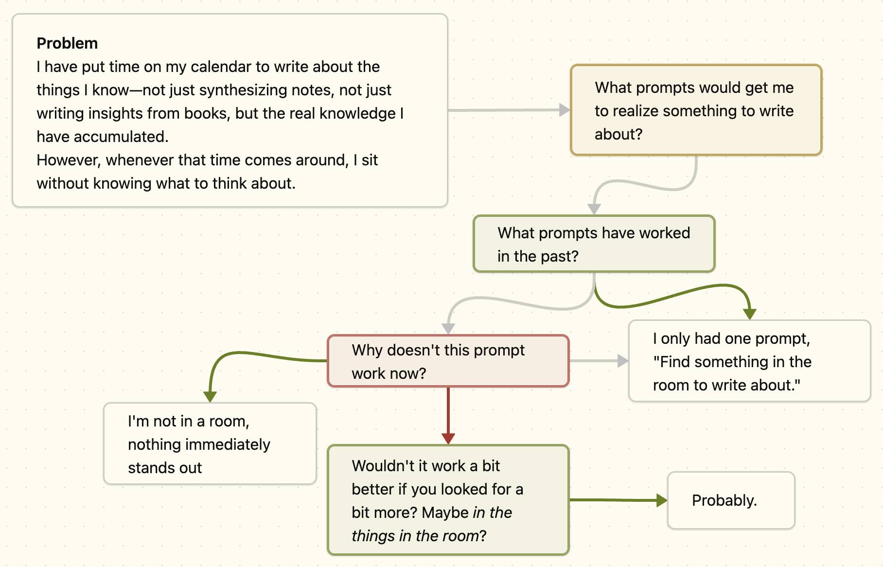 As you can see, I wrote down a few words about my problem. Then, I formulated a question—the box in orange. No answer came to me immediately, so I posed a question I thought might help give me direction. I had an immediate answer, but this also prompted a further question. The cycle continued until I found some answer to the problem in that case, but I did not end up investing enough effort to resolve the original prompt.